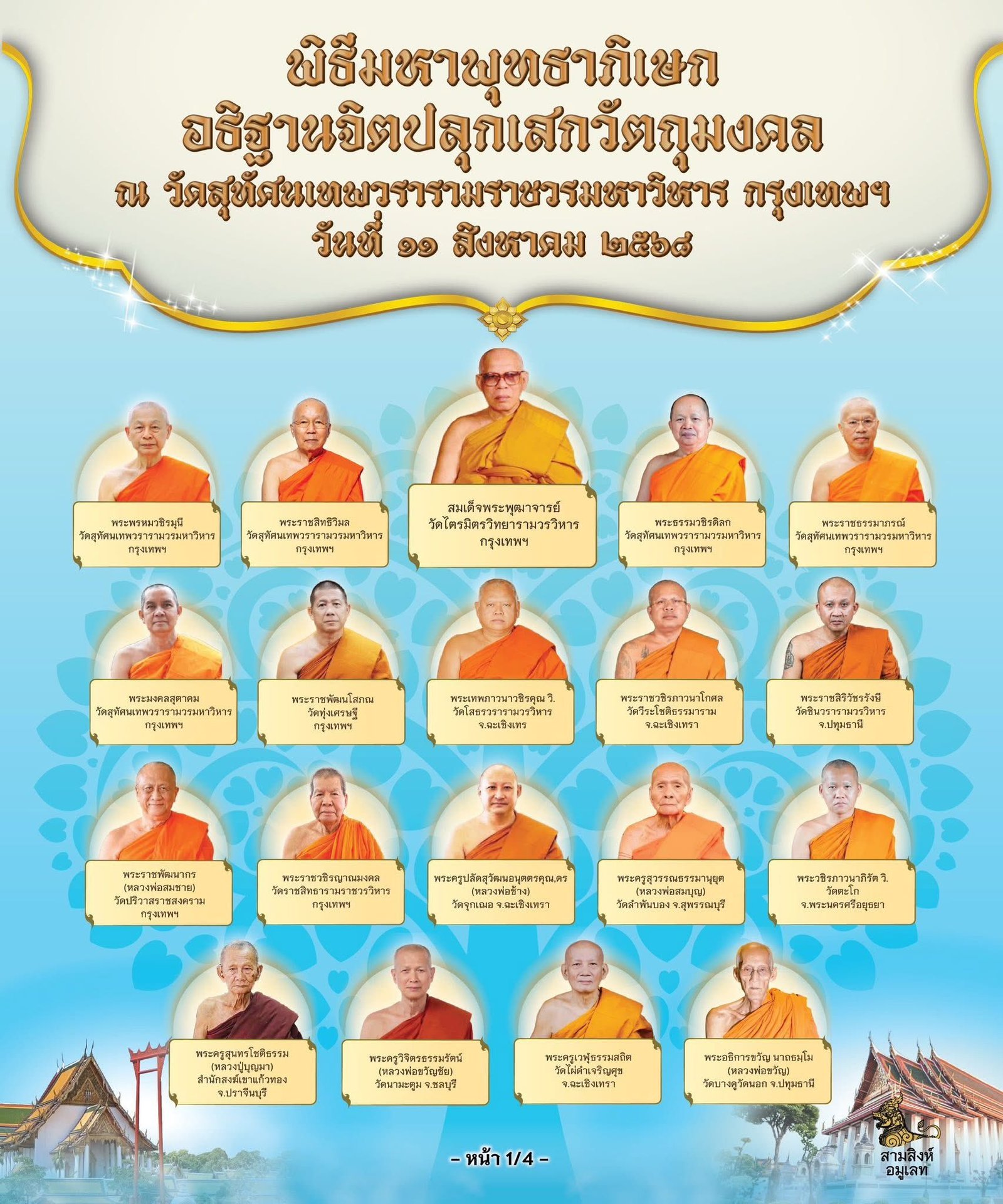 วันเสาร์ที่ ๙ สิงหาคม พุทธศักราช ๒๕๖๘ พิธีพุทธาภิเษก ณ วิหารสมเด็จโตฯ วัดระฆังโฆสิตารามวรมหาวิหาร เริ่มพิธีบวงสรวง ๑๒.๐๙ มีวัตถุมงคลเข้าร่วมพิธีดังนี้