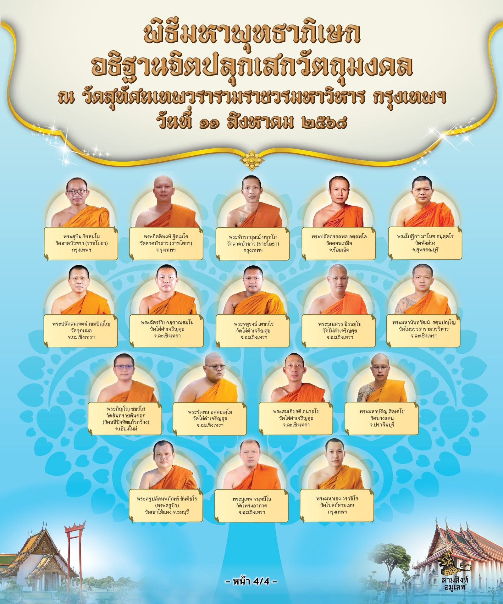 วันจันทร์ที่ ๑๑ สิงหาคม พุทธศักราช ๒๕๖๘ พิธีพุทธาภิเษก ณณ วัดสุทัศนเทพวรารามราชวรมหาวิหาร เริ่มพิธีบวงสรวงในเวลา ๐๙.๐๙ น. รวมเกจิคณาจารย์ ๑๐๘ รูป มีวัตถุมงคลเข้าร่วมพิธีดังนี้