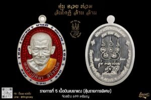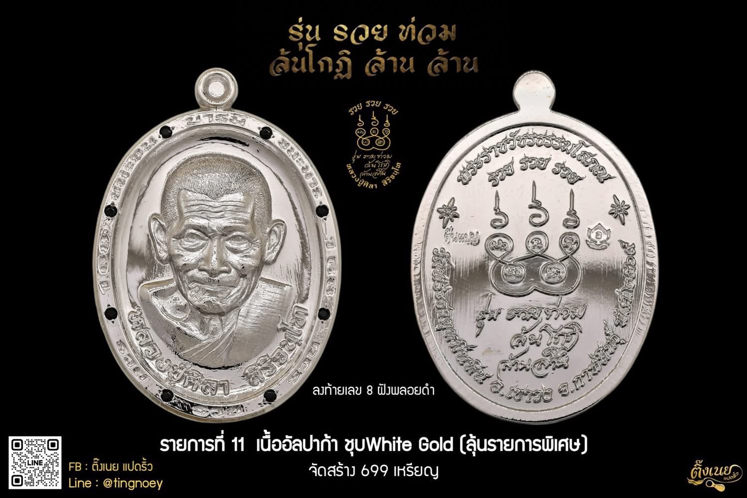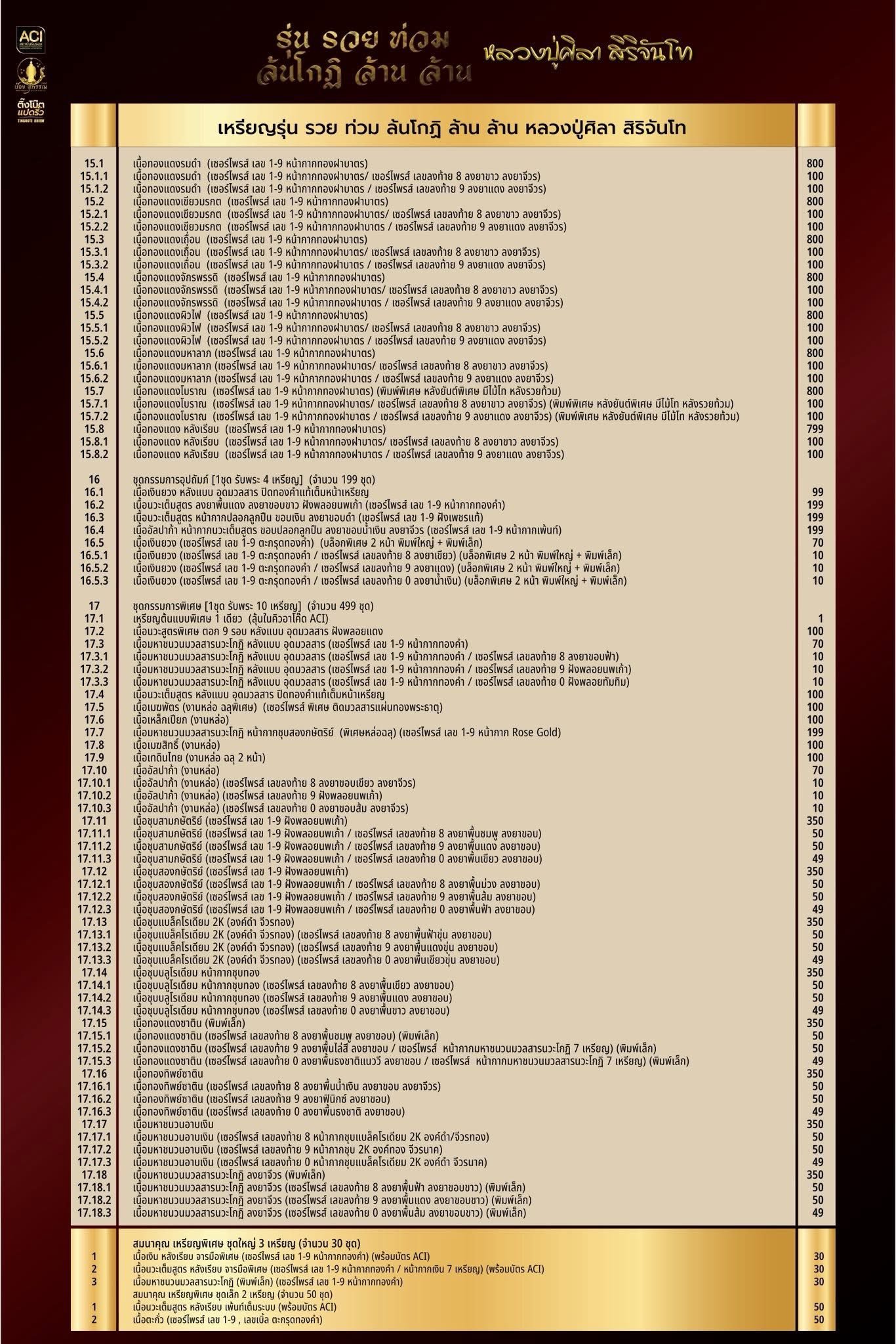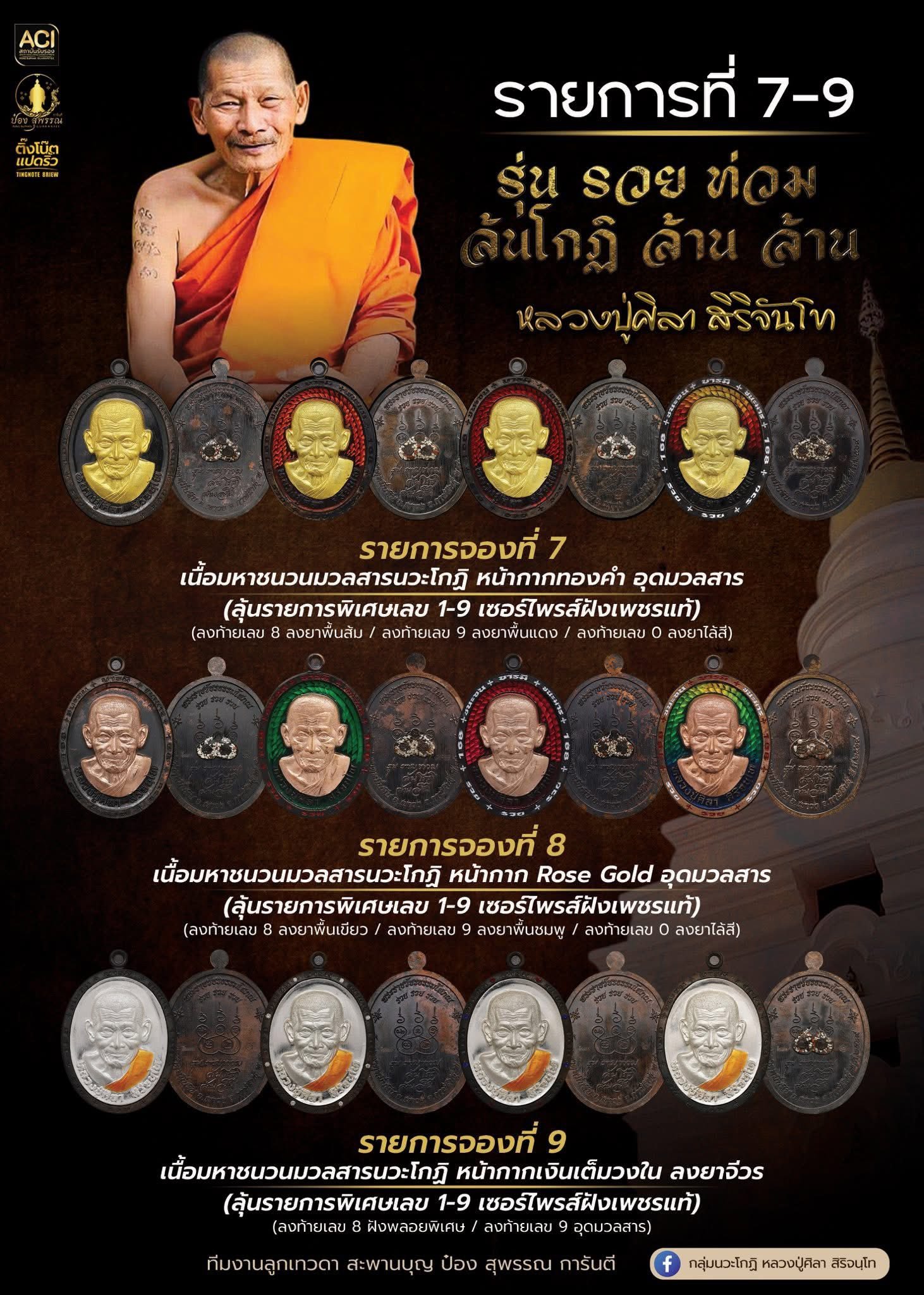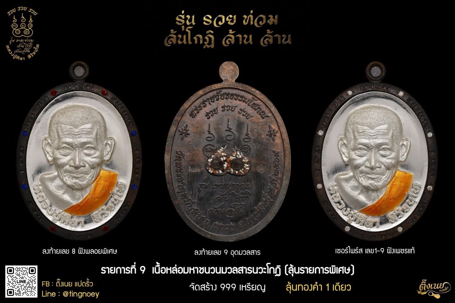 รายการจองที่ ๙ เนื้อมหาชนวนนวะโกฏิ หน้ากากเงินเต็มวงใน ลงยาจีวร จัดสร้างเพียง ๙๙๙ เหรียญ เท่านั้น รายการพิเศษสำหรับผู้ร่วมบุญทุกท่าน ท่านจะได้รับเหรียญทองคำ ฝังเพชรแท้ โค้ดต้นแบบ จัดสร้างจำนวน ๑ เหรียญ เงื่อนไขสำหรับผู้มีสิทธิ์รับรายการพิเศษ มีดังนี้