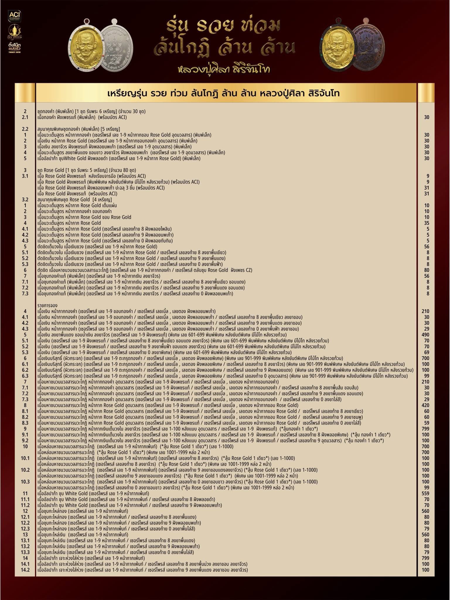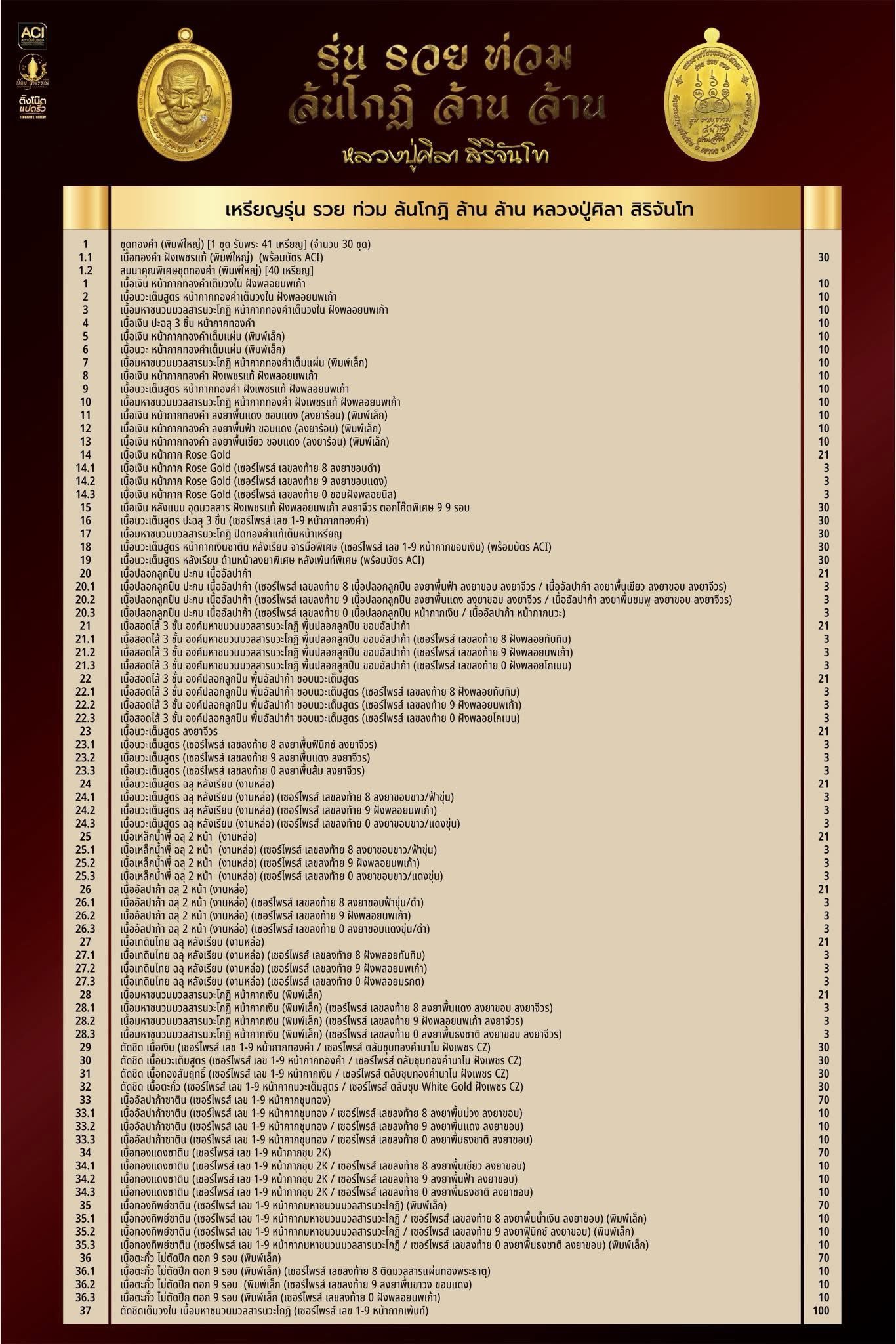 ใบรายการชุดทองคำ (พิมพ์ใหญ่) รายการจองที่ ๑ หนึ่งชุด รับพระ ๔๑ เหรียญ