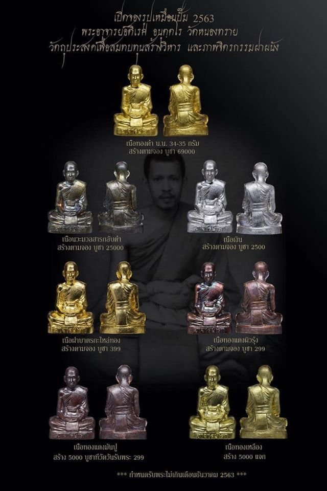 รายการวัตถุงคลที่เปิดให้ร่วมบุญบูชา และรับแจกในงานพิธีวันเสาร์ที่ ๕ ธันวาคม ๒๕๖๓ โดยจะเริ่มเปิดให้บูชาและรับแจกวัตถุมงคลพร้อมกันในเวลา ๐๗.๓๐น.เป็นต้นไป (ณ.ศาลาด้านหลังวิหาร)